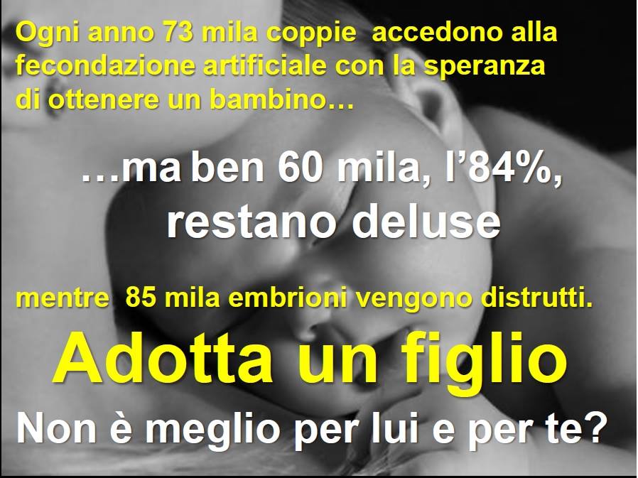 E’ chiaro che per favorire l’abbandono del bimbo alla nascita da parte della gestante quale alternativa all’aborto, occorre promuovere una azione culturale per farle accettare, cosa non sempre facile, almeno la gravidanza. L’impegno per il mondo pro-life è grande, ma la posta in gioco è altissima: la vita di quasi 200 mila bambini l’anno e la felicità di tutte le coppie sterili, non solo di un esiguo 16%.